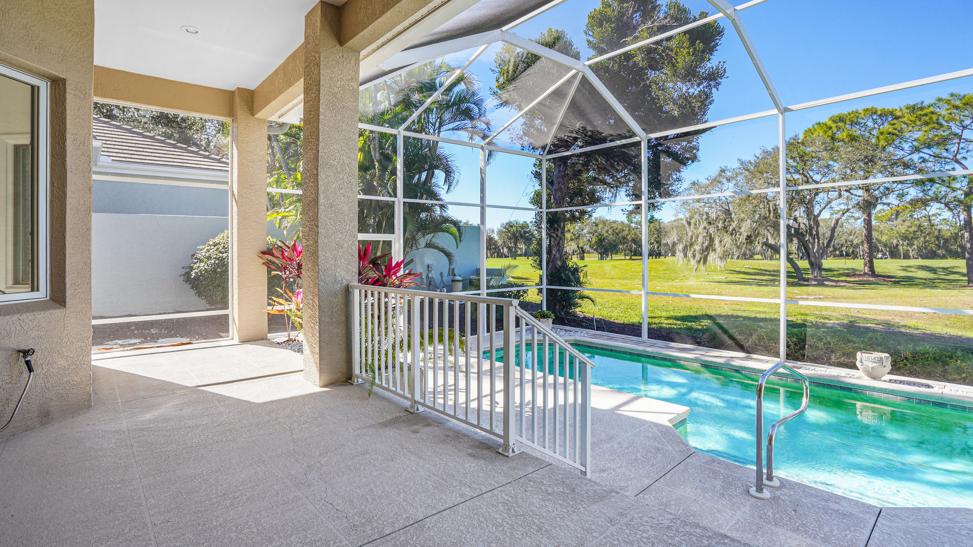3-bedroom, 2-bath residence offers a private screened pool, long-range views of the golf course and lake, and a low-maintenance lifestyle with no CDD fees and not in a flood zone.